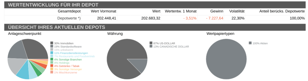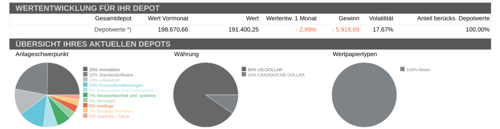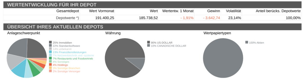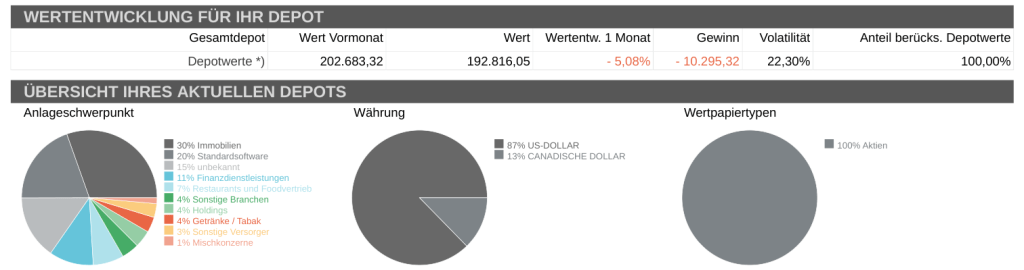 Das Depot ist bei 8.105 Euro gestartet und hat 3.352,70 Euro an Gewinnen generiert. Dies entspräche einem Wertzuwachs von 41,36%. Zur Vola habe ich leider keine Daten.