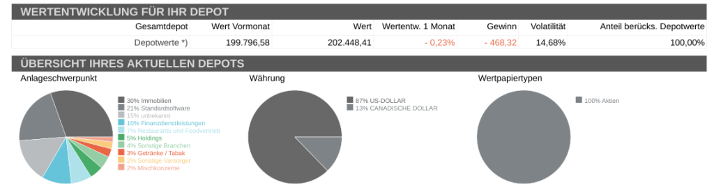 Der Wert des Depots hat sich von 9.229,03 Euro auf 13.841,56 Euro erhöht. Der Wertzuwachs lag bei 38,50% und die Vola bei 14,09%. Auch mit diesem Depot bin ich sehr zufrieden.